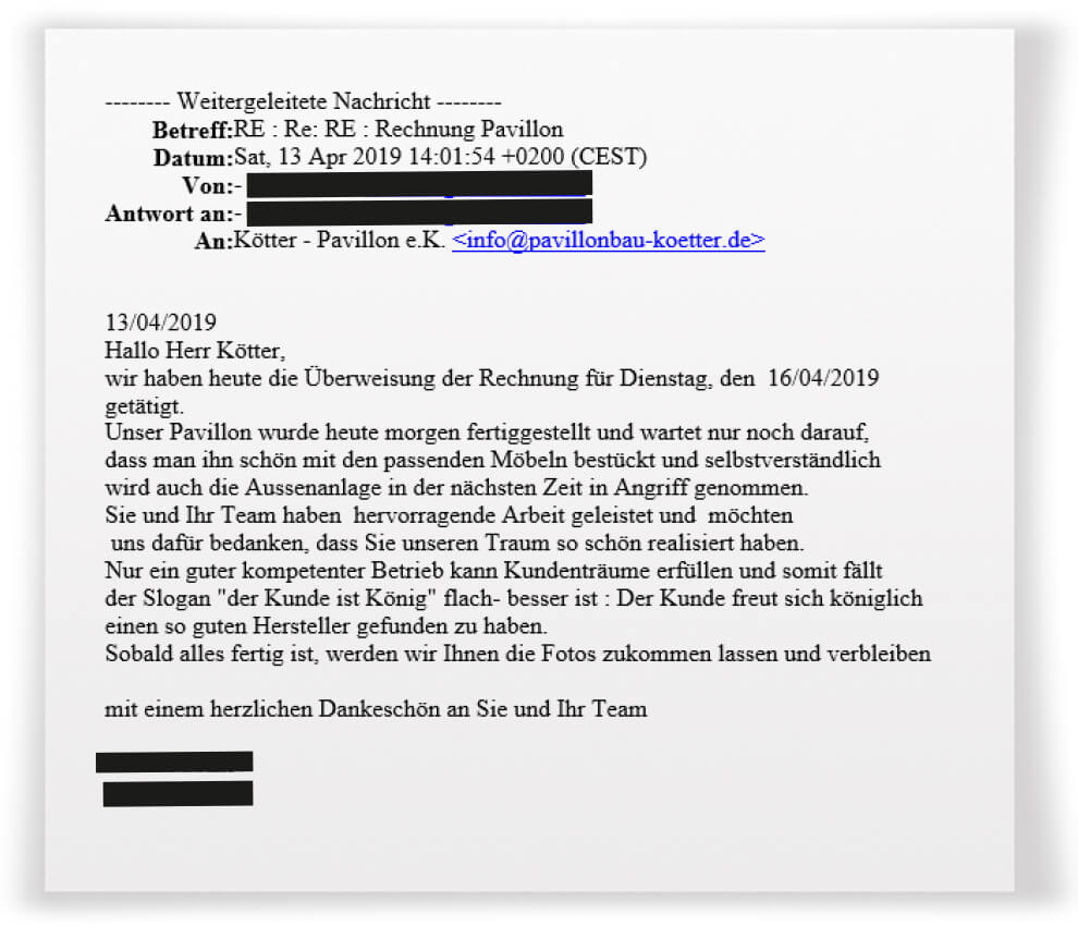 Nun haben wir uns dazu entschlossen die Kundenstimmen auch hier auf der Website zu veröffentlichen. Selbstverständlich werden alle Informationen die Rückschlüsse auf Ihre Person zulassen unkenntlich gemacht. Wenn auch Sie uns eine "Kundenstimme" zukommen lassen möchten, Senden Sie uns einfach eine E-Mail an info@pavillonbau-koetter.de - wir freuen uns!