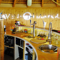 Aus einem "Traum" heraus ist auch dieser Pavillon mit integriertem Weinkeller entstanden. Der Pavillon ist voll unterkellert und verfügt über eine Wendeltreppe die hinter der Theke eingebaut wurde. Ein besonderer Clou ist die begehbare in den Boden eingelassene Glasscheibe, die den Gästen einen interessanten Blick auf die Weinvorräte bietet.